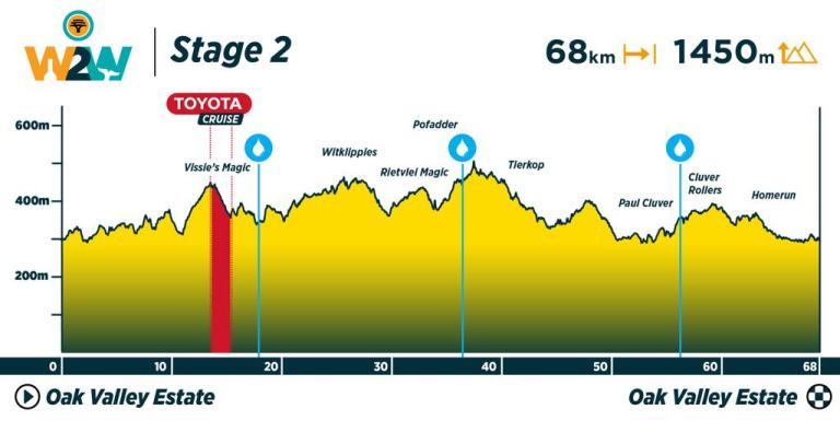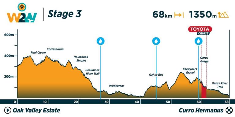 The final stage of the 2022 FNB Wines2Whales takes teams from Oak Valley Estate, in Elgin, to the Atlantic coast where the finish at Curro School in Hermanus awaits. At 68 kilometres long with 1 350 metres of climbing it is statistically the easiest day of the race, through it is not all downhill to the ocean. The stage begins with dual tracks to spread the batches before the new Korteshoven singletracks thrill and delight ahead of dropping through the Houw Hoek singletracks and the Kat Pas. Near the bottom of the historic pass the new additions to the route, the Beaumont River Trail and the Rail Trail, divert the race around Botrivier and to Water Point 1, at Beaumont. Dipping under the N2 via the Agrimark bridge into Wildekrans, the fun continues on even more singletracks. Then its onwards to Harlow’s Run and the Steel Bridge before the Karwyders Contour takes riders to waterpoint 2, at the Arthouse, and on to Gaf se Bos. The Karwyders Gravel provides an opportunity to jockey for places ahead of the final singletrack dash, down the Onrus Gorge, the final stage’s Toyota Cruise section, and into the Onrus River Trail to the finish line at the Curro School in Hermanus.